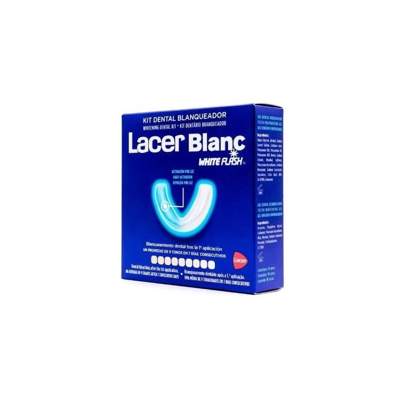 El gel dental blanqueador de Lacer Blanc White Flash contiene el activo blanqueador percarbonato sódico, una sustancia que bajo los efectos de la fotoluminiscencia de la férula y las condiciones creadas por el gel preparador, reacciona liberando peróxido de hidrógeno. El peróxido de hidrógeno actuará como radical libre contra las partículas pigmentadas que están incrustadas en el esmalte dental, rompiéndolas y descomponiéndolas en moléculas más pequeñas y solubles. De este modo, pueden ser arrastradas por el agua al enjuagar al finalizar un uso del kit, consiguiendo unos resultados deslumbrantes desde la primera aplicación.