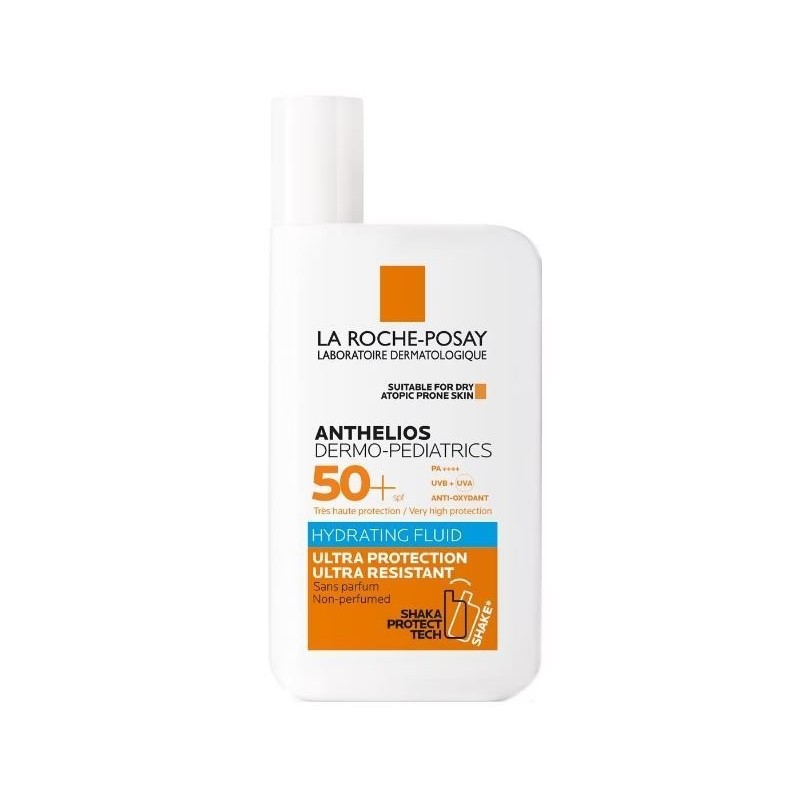 Anthelios Dermo Pediatric Hydrating Fluid SPF50+ es un protector solar de rostro para la piel atópica de los más pequeños. Tiene además una muy alta protección de amplio espectro UVB SPF50+ , UVA (PPD46) y una acción antioxidante frente a infrarrojos -A y polución.